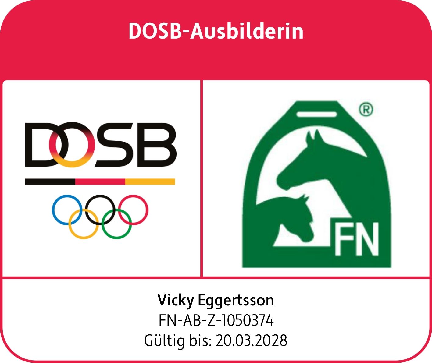 Pferdewirtschaftmeisterin | IPZV-Ausbilderin | IPZV-Trainerin A | IPZV- Bereiterin | Internationale Sportrichterin | mehrfache Deutsche und Mitteleuropäische Meisterin im 5-Gang, T2 und in der Passprüfung | 3-malige WM-Finalistin im Fünfgang | aktuelles Mitglied im Bundeskader des IPZV e.V. | Hofchefin und Stylistin, zuständig für’s Feine „Du willst mit DIESEM Sakko und DIESER Hose aufs Turnier? Sicher?“
