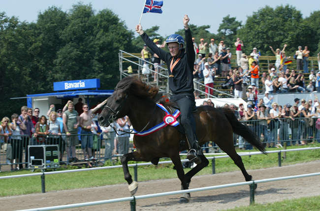 5-facher Weltmeister im Rennpass mit seinem Reiter Bergthór Eggertsson „Alt? Wer ist hier alt???“. Mittlerweile genießt er sein Rentnerdasein bei den Junghengsten auf der Weide.